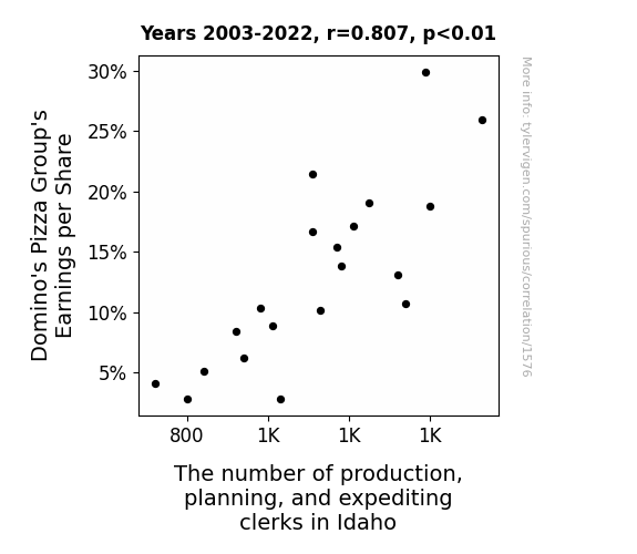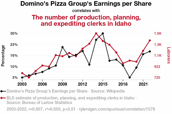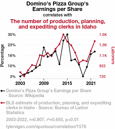 - The spurious research paper: The Cheese Factor: Unveiling the Delicious Connection Between Domino's Pizza Group's Earnings per Share and the Number of Production, Planning, and Expediting Clerks in Idaho