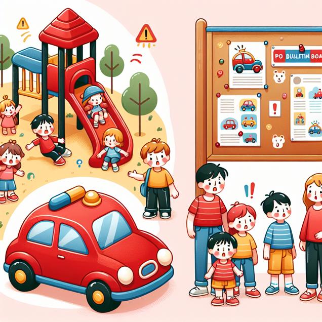 ChatGPT: Prompt: Generate an image of a vibrant playground scene featuring a bright red toy car named "Daniela" being adored by a group of children. Alongside the playground, show a bulletin board displaying a notice about automotive recalls for trailer hitches, with a group of concerned parents reading the information. The style should have adorable and childlike graphics that evoke a sense of playfulness and concern.