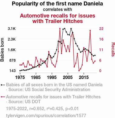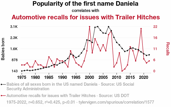 - The spurious research paper: Hitching a Ride on the Daniela Wave: An Examination of the Correlation Between the Popularity of the Name Daniela and Automotive Recalls for Trailer Hitch Issues