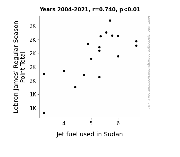 This means 54.8% of the change in the one variable (i.e., Jet fuel used in Sudan) is predictable based on the change in the other (i.e., Lebron James' Regular Season Point Total) over the 18 years from 2004 through 2021.
