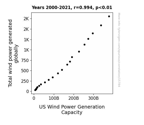 This means 98.8% of the change in the one variable (i.e., US Wind Power Generation Capacity) is predictable based on the change in the other (i.e., Total wind power generated globally) over the 22 years from 2000 through 2021.