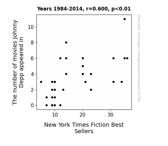 This means 36.1% of the change in the one variable (i.e., New York Times Fiction Best Sellers) is predictable based on the change in the other (i.e., The number of movies Johnny Depp appeared in) over the 31 years from 1984 through 2014.