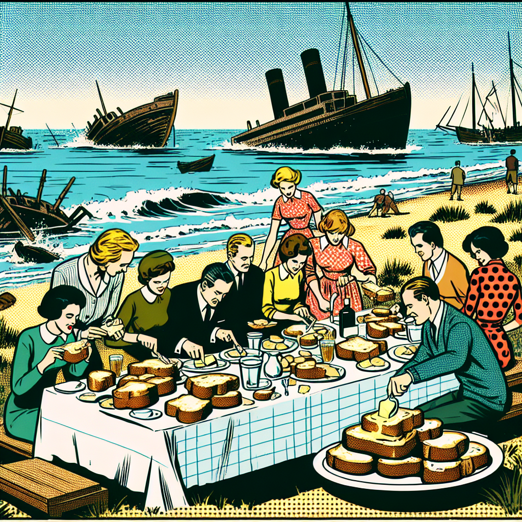 ChatGPT: Generate a comic-book-style illustration with muted colors and a dotted halftone pattern from the 1960s depicting a group of people enjoying a picnic by the seaside. They are seen spreading generous amounts of butter on freshly-baked bread. In the distance, several shipwrecks can be seen scattered along the shoreline, evidence of the perilous waters. The scene should be simple yet evocative, capturing the nostalgia and adventure of old comic-style artwork.