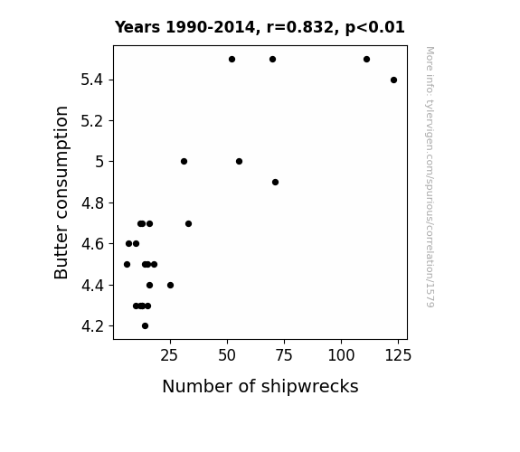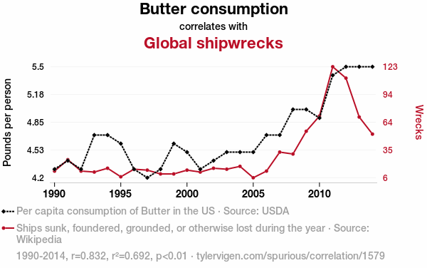 butter consumption, global shipwrecks, statistical analysis, correlation coefficient, causal mechanisms