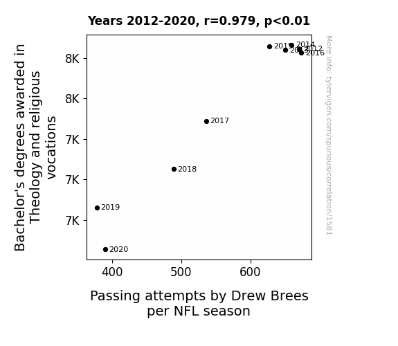 This means 95.8% of the change in the one variable (i.e., Passing attempts by Drew Brees per NFL season) is predictable based on the change in the other (i.e., Bachelor's degrees awarded in Theology and religious vocations) over the 9 years from 2012 through 2020.