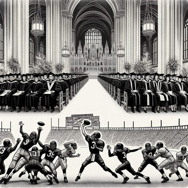 ChatGPT: Generate an image that resembles a classic black-and-white newspaper illustration, depicting a graduation ceremony at an ornate cathedral. The scene should capture graduates receiving Bachelor's degrees in Theology and religious vocations. In the background, depict Drew Brees quarterbacking a football game, making precise passing attempts under the bright stadium lights. The illustration should emphasize the contrast between the solemn ceremony and the energetic football game playing out simultaneously. Each element should be distinct but seamlessly merged into a cohesive visual composition.