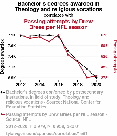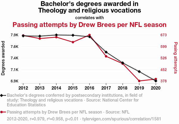 This means 95.8% of the change in the one variable (i.e., Passing attempts by Drew Brees per NFL season) is predictable based on the change in the other (i.e., Bachelor's degrees awarded in Theology and religious vocations) over the 9 years from 2012 through 2020.