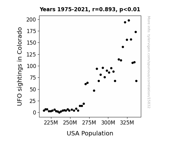 This means 79.7% of the change in the one variable (i.e., USA Population) is predictable based on the change in the other (i.e., UFO sightings in Colorado) over the 47 years from 1975 through 2021.