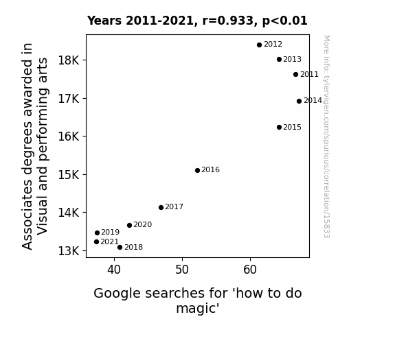 This means 87% of the change in the one variable (i.e., Google searches for 'how to do magic') is predictable based on the change in the other (i.e., Associates degrees awarded in Visual and performing arts) over the 11 years from 2011 through 2021.