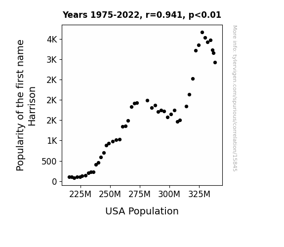 This means 88.5% of the change in the one variable (i.e., USA Population) is predictable based on the change in the other (i.e., Popularity of the first name Harrison) over the 48 years from 1975 through 2022.