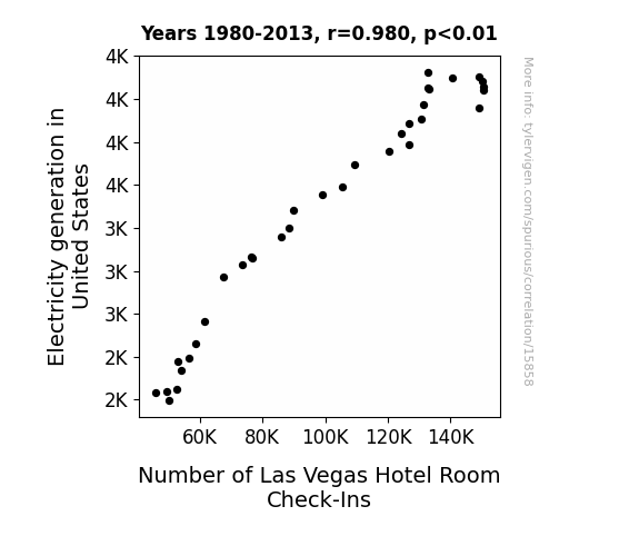 This means 96% of the change in the one variable (i.e., Number of Las Vegas Hotel Room Check-Ins) is predictable based on the change in the other (i.e., Electricity generation in United States) over the 34 years from 1980 through 2013.