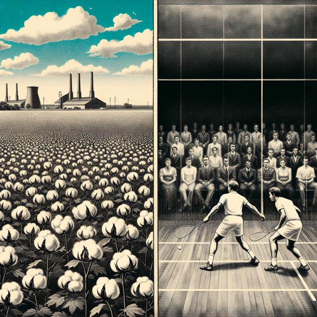ChatGPT: Generate an image in the style of a vintage black-and-white newspaper illustration that contrasts the serene setting of an Arkansas cotton field with the intense action of a World Open Squash Men's championship match. In the illustration, showcase tall genetically modified cotton plants swaying in the breeze under the radiant sun, juxtaposed with the dramatic image of two squash players engaged in an epic and intense five-set final match, volleying the ball back and forth. The illustration should capture the energy and contrast between the tranquil cotton field and the competitive squash championship.
