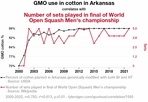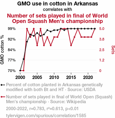 This means 61.3% of the change in the one variable (i.e., Number of sets played in final of World Open Squash Men's championship) is predictable based on the change in the other (i.e., GMO use in cotton in Arkansas) over the 23 years from 2000 through 2022.