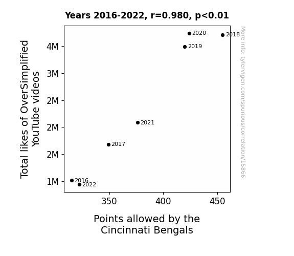This means 96% of the change in the one variable (i.e., Points allowed by the Cincinnati Bengals) is predictable based on the change in the other (i.e., Total likes of OverSimplified YouTube videos) over the 7 years from 2016 through 2022.