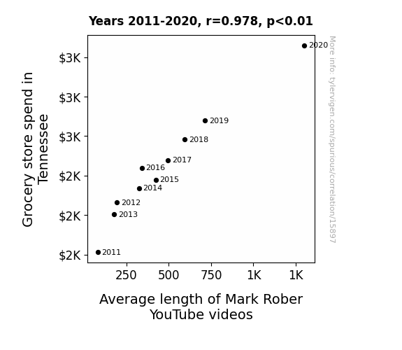 This means 95.7% of the change in the one variable (i.e., Average length of Mark Rober YouTube videos) is predictable based on the change in the other (i.e., Grocery store spend in Tennessee) over the 10 years from 2011 through 2020.