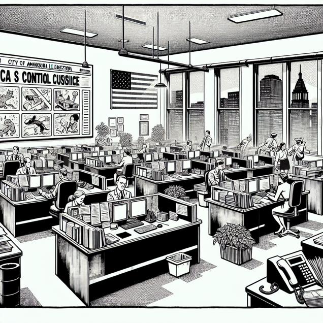 ChatGPT: Generate an image that resembles a black-and-white newspaper illustration. Depict a cozy office in New Jersey, with an xkcd comic about politics taped to the wall eliciting chuckles from animal control workers. The room is filled with the sound of ringing phones and lively discussion as the workers go about their duties, ensuring the well-being of the state's furry and feathered residents. Capture the essence of a bustling yet lighthearted atmosphere in the office, with attention to detail on the characters and their activities.