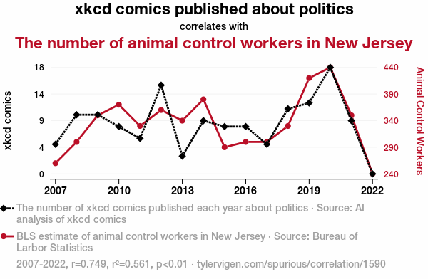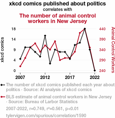 User prompt: Please make up a funny explanation for how a decrease in xkcd comics published about politics caused The number of animal control workers in New Jersey to decrease.