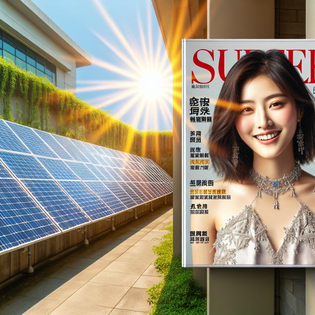 Prompt: Generate an image of a TIME magazine cover featuring a young woman in her 20s standing in a sunny courtyard in Taiwan next to a row of sleek, modern solar panels. The woman is smiling proudly, basking in the glow of her recent win as the youngest Best Supporting Actress at the Academy Awards. The bright sunlight is being captured by the solar panels, symbolizing the conversion of clean energy while the woman represents youthful talent and success. The depiction should include only scenes, people, and objects, it should not include text or speech bubbles.