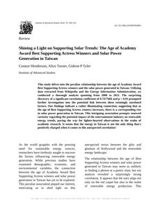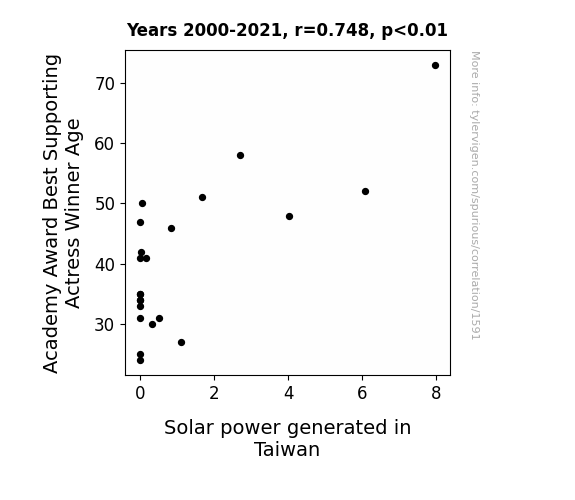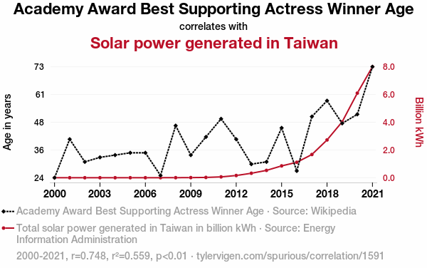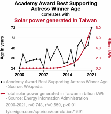 User prompt: Please provide potential search keywords for a paper titled Shining a Light on Supporting Solar Trends: The Age of Academy Award Best Supporting Actress Winners and Solar Power Generation in Taiwan with an abstract of This study delves into the peculiar relationship between the age of Academy Award Best Supporting Actress winners and the solar power generated in Taiwan. Utilizing data extracted from Wikipedia and the Energy Information Administration, we conducted a thorough analysis spanning from 2000 to 2021. The surprising discovery of a significant correlation coefficient of 0.7477684 and p < 0.01 prompted further investigation into the potential link between these seemingly unrelated factors.