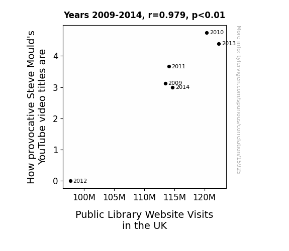 This means 95.9% of the change in the one variable (i.e., Public Library Website Visits in the UK) is predictable based on the change in the other (i.e., How provocative Steve Mould's YouTube video titles are) over the 6 years from 2009 through 2014.