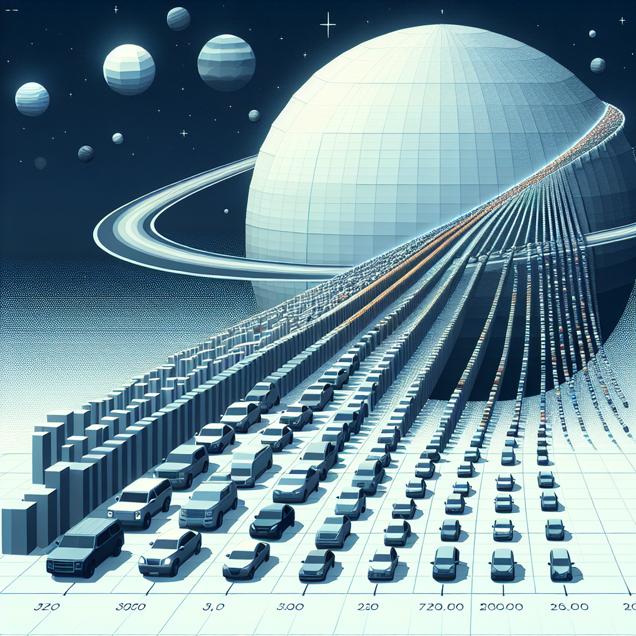 Prompt: Generate an image of a low poly scene, where a massive graph dominates the center, with Uranus and Mercury represented as planets on one axis, and rows of Nissan cars on the other. The length of the graph signifies the distance from Uranus to Mercury, while each row of cars represents different automotive recalls issued by Nissan North America. The cars are parked at varying intervals along the graph, symbolizing the timeline of the recalls in relation to the planetary distance. The overall aesthetic should remain simple yet visually engaging. The depiction should include only scenes, people, and objects, it should not include text or speech bubbles.