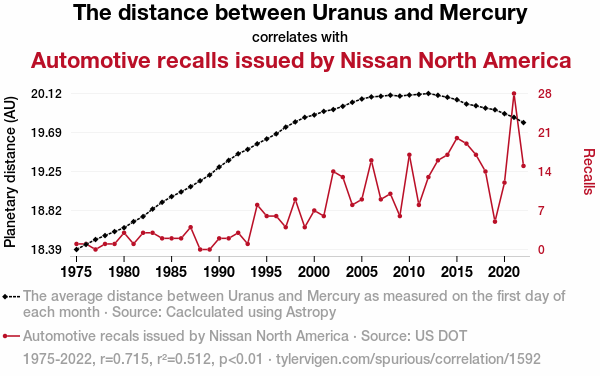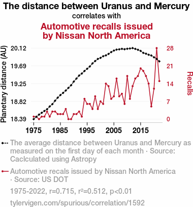 This means 51.2% of the change in the one variable (i.e., Automotive recalls issued by Nissan North America) is predictable based on the change in the other (i.e., The distance between Uranus and Mercury) over the 48 years from 1975 through 2022.