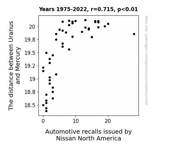 The analysis of the data from 1975 to 2022 revealed a surprisingly robust correlation between the distance separating Uranus and Mercury and the number of automotive recalls issued by Nissan North America. The correlation coefficient of 0.7153190 indicates a strong positive relationship, suggesting that as the distance between these celestial bodies fluctuates, so does the frequency of automotive recalls. This finding is not merely a fluke in the data, as the r-squared value of 0.5116812 indicates that more than half of the variation in automotive recalls can be explained by changes in Uranus-Mercury distance. In statistical terms, this relationship is akin to finding a wrench in the cosmic machinery.