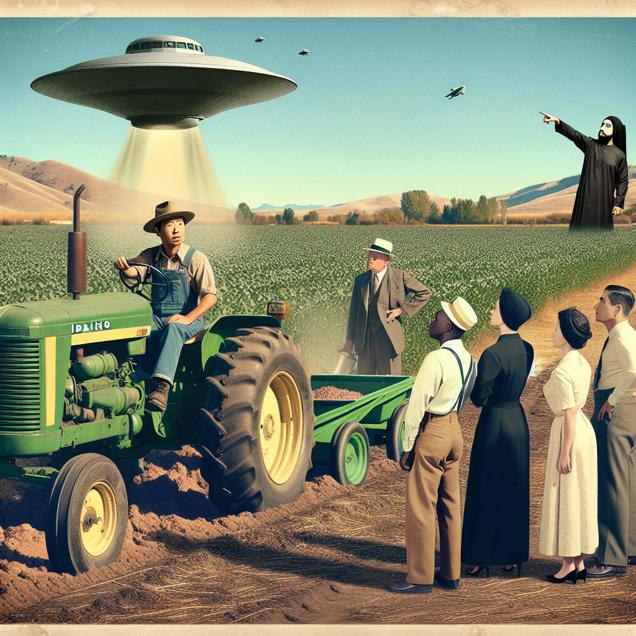 ChatGPT: In a rural field in Idaho, a farmer is spreading sewage sludge as fertilizer using a tractor while in the clear sky above, a group of people are pointing and observing an unidentified flying object.