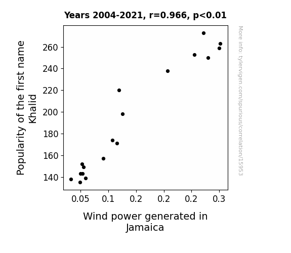 This means 93.4% of the change in the one variable (i.e., Wind power generated in Jamaica) is predictable based on the change in the other (i.e., Popularity of the first name Khalid) over the 18 years from 2004 through 2021.