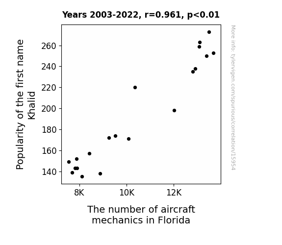This means 92.3% of the change in the one variable (i.e., The number of aircraft mechanics in Florida) is predictable based on the change in the other (i.e., Popularity of the first name Khalid) over the 20 years from 2003 through 2022.