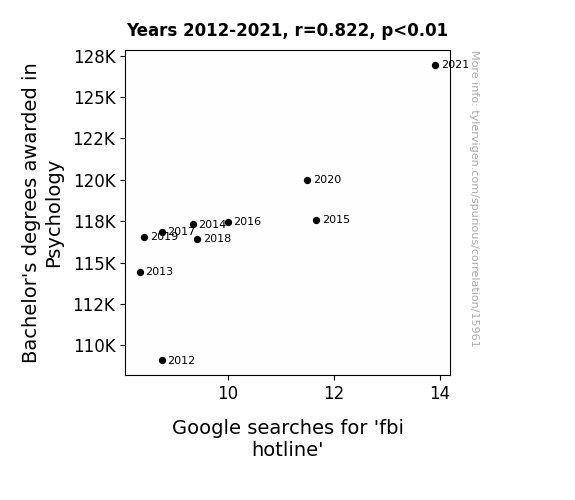 This means 67.6% of the change in the one variable (i.e., Google searches for 'fbi hotline') is predictable based on the change in the other (i.e., Bachelor's degrees awarded in Psychology) over the 10 years from 2012 through 2021.