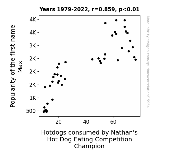 This means 73.8% of the change in the one variable (i.e., Hotdogs consumed by Nathan's Hot Dog Eating Competition Champion) is predictable based on the change in the other (i.e., Popularity of the first name Max) over the 44 years from 1979 through 2022.