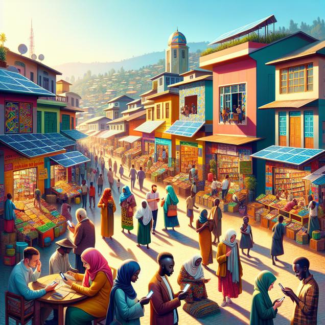 Prompt: Generate an image of a bustling marketplace in Rwanda, where colorful local shops with solar panels on their rooftops are bathed in sunlight. The scene includes people walking and using their smartphones to search for "dollar store near me" on Google. Capture the lively atmosphere, vibrant colors of the market, and the juxtaposition of traditional architecture with modern technology. The depiction should include only scenes, people, and objects, it should not include text or speech bubbles.