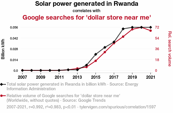 This means 98.3% of the change in the one variable (i.e., Google searches for 'dollar store near me') is predictable based on the change in the other (i.e., Solar power generated in Rwanda) over the 15 years from 2007 through 2021.