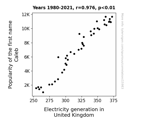 This means 95.2% of the change in the one variable (i.e., Electricity generation in United Kingdom) is predictable based on the change in the other (i.e., Popularity of the first name Caleb) over the 42 years from 1980 through 2021.