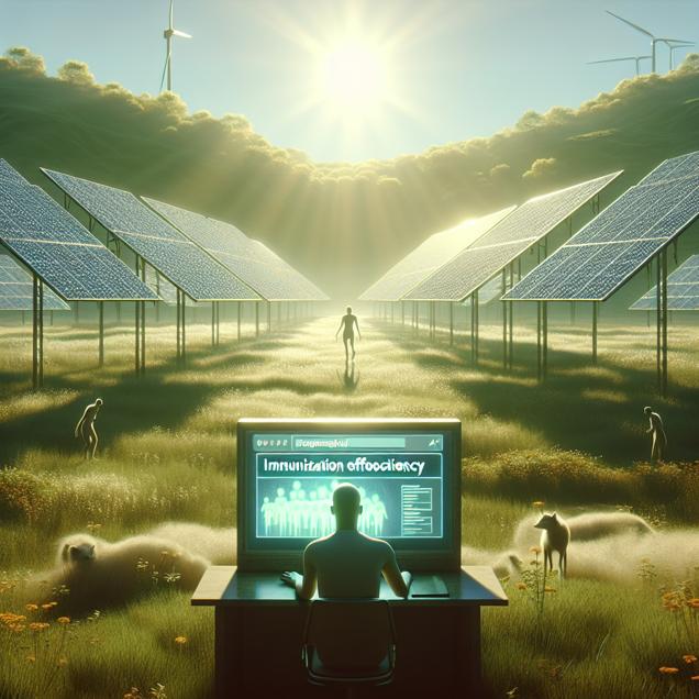 Prompt: Generate an image of a futuristic world where a meadow in Argentina is filled with towering solar panels glistening in the sunlight. Amidst this scene, a solitary figure sits in front of a computer, surrounded by an aura of curiosity and determination. The individual is engaged in a quest for knowledge, typing the question "do vaccines work" into a search engine, striving to uncover the truth amidst the serene and sustainable landscape. The depiction should include only scenes, people, and objects, it should not include text or speech bubbles.