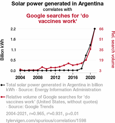 This means 93.1% of the change in the one variable (i.e., Google searches for 'do vaccines work') is predictable based on the change in the other (i.e., Solar power generated in Argentina) over the 18 years from 2004 through 2021.