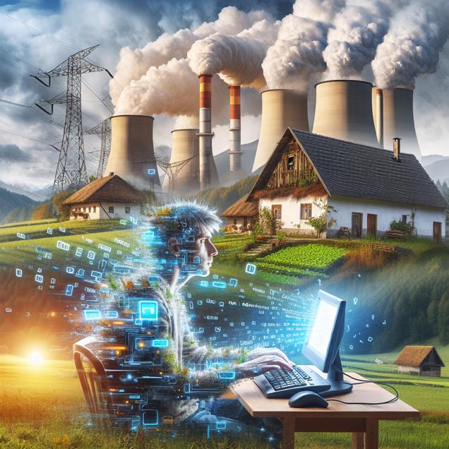Prompt: Generate an image of a serene countryside in Serbia with a high-tech twist. In the background, a modern power plant emits billowing steam as it harnesses biomass for electricity. In the foreground, a person is seated at a computer, their face expressing urgency as they frantically type "i am dizzy" into the Google search bar. The juxtaposition of traditional rural scenery and advanced technology should be evident, conveying a sense of urgency and the intersection of modern life and nature. The depiction should include only scenes, people, and objects, it should not include text or speech bubbles.