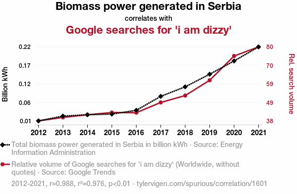 Biomass power generation, Serbia, Google searches, "I am dizzy", correlation coefficient, Energy Information Administration, Google Trends, association, human perception, Biomass energy, Serbia, power generation, Google, correlation analysis, renewable energy, dizzy, dizziness, search frequency, internet searches