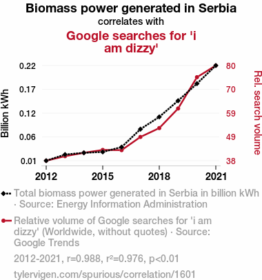 - The spurious research paper: The Power of Biomass: A Spin on Google Searches for 'I Am Dizzy'