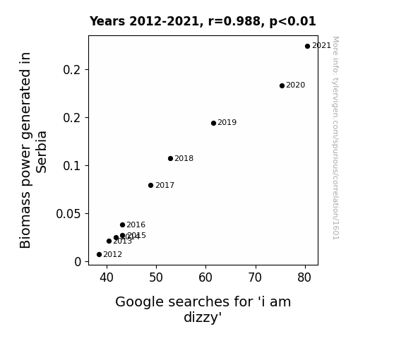This means 97.6% of the change in the one variable (i.e., Google searches for 'i am dizzy') is predictable based on the change in the other (i.e., Biomass power generated in Serbia) over the 10 years from 2012 through 2021.