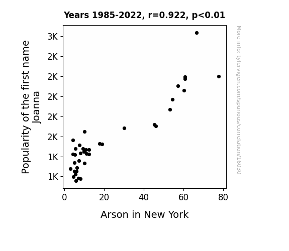 This means 85% of the change in the one variable (i.e., Arson in New York) is predictable based on the change in the other (i.e., Popularity of the first name Joanna) over the 38 years from 1985 through 2022.