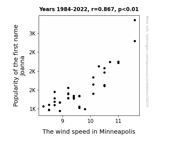 This means 75.2% of the change in the one variable (i.e., The wind speed in Minneapolis) is predictable based on the change in the other (i.e., Popularity of the first name Joanna) over the 39 years from 1984 through 2022.