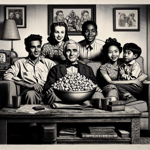 User prompt: Please respond with an image generation prompt that would be likely to create an interesting visual using DALLE-3, using the following style: [ A black-and-white newspaper illustration ] and depicting this scene: In a cozy living room, a family settles in to watch "The Big Bang Theory" on TV. On the coffee table in front of them is a bowl of crispy, buttery popcorn made from delicious GMO corn. The TV screen shows the quirky characters of the show, while the family enjoys their snack made possible by GMO technology. Keep the visual depiction simple. Do not include any words or speech bubbles.