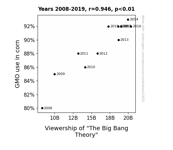 This means 89.5% of the change in the one variable (i.e., Viewership of "The Big Bang Theory") is predictable based on the change in the other (i.e., GMO use in corn) over the 12 years from 2008 through 2019.