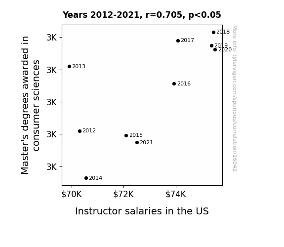 This means 49.7% of the change in the one variable (i.e., Instructor salaries in the US) is predictable based on the change in the other (i.e., Master's degrees awarded in consumer sciences) over the 10 years from 2012 through 2021.
