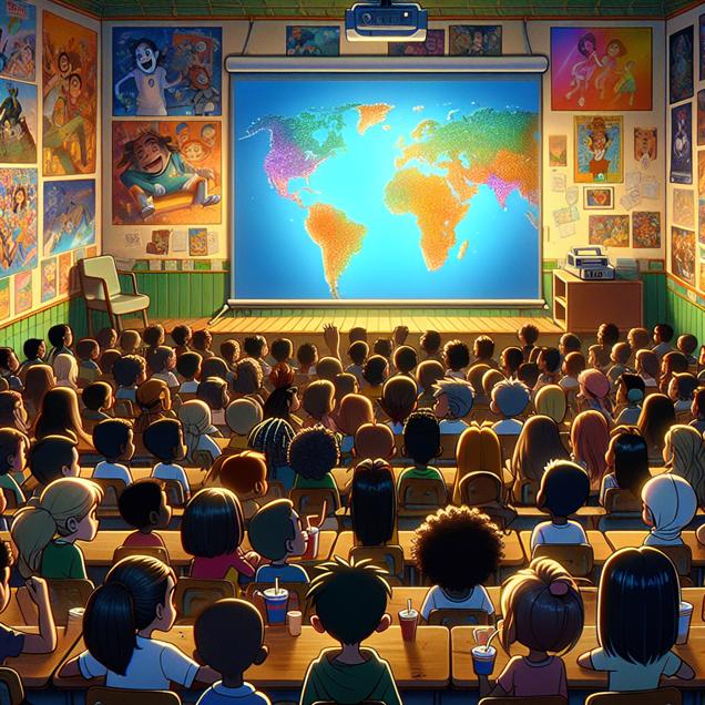 Prompt: Generate an image that looks like it is a scene from a Pixar movie and depicts a group of diverse US kids in a public school classroom eagerly watching a popular UK film on a projector. A world map on the wall shows the global box office revenue of UK films soaring to new heights. The kids are smiling and engaged in the movie, and there's a sense of excitement and wonder in the air. The projector light casts a warm glow on their faces, and the map on the wall is illuminated, drawing attention to the worldwide impact of UK cinema. The scene captures the joy of cultural exchange and the power of storytelling to transcend borders and bring people together. The depiction should include only scenes, people, and objects, it should not include text or speech bubbles.