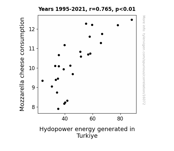 This means 58.6% of the change in the one variable (i.e., Hydopower energy generated in Turkiye) is predictable based on the change in the other (i.e., Mozzarella cheese consumption) over the 27 years from 1995 through 2021.