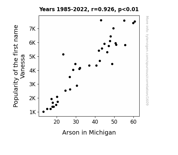 User prompt: Please provide potential search keywords for a paper titled Playing with Fire: Exploring the Incendiary Relationship Between the Popularity of the Name Vanessa and Arson in Michigan with an abstract of This paper investigates the curious correlation between the rise of the name Vanessa and the incidence of arson in the state of Michigan. Utilizing data from the US Social Security Administration and FBI Criminal Justice Information Services spanning from 1985 to 2022, our research team uncovered a striking correlation coefficient of 0.9260921 and p < 0.01, suggesting a significant relationship between the two variables. While the findings are certainly intriguing, we emphasize the importance of interpreting correlation as not implying causation, and we encourage further exploration into the underlying mechanisms behind this unexpected linkage. The study offers a fresh perspective on the nuances of nomenclature and its potential impact on behavior, as well as sparking curiosity about the potential fire-related origin of the name itself.