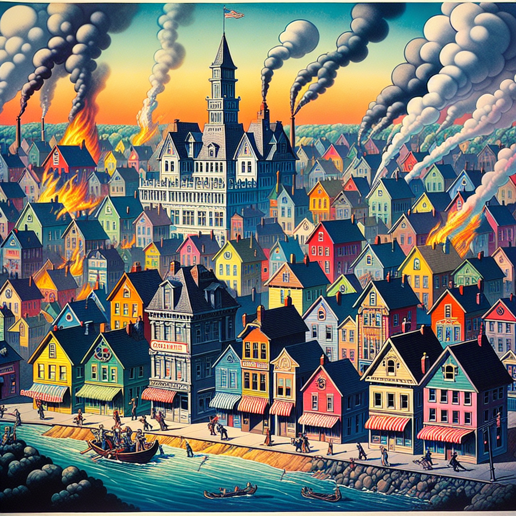 ChatGPT: Generate an image that captures a vibrant Michigan town scene reminiscent of a Pixar movie. In the foreground, several cheerful storefronts and buildings are adorned with colorful banners displaying the name "Vanessa," exuding a sense of shared identity and popularity. However, in the distance, a building is depicted with plumes of smoke rising, indicating firefighting efforts to quell the arson-induced fire. The contrasting elements of community celebration and crisis response are artfully blended within the visual.